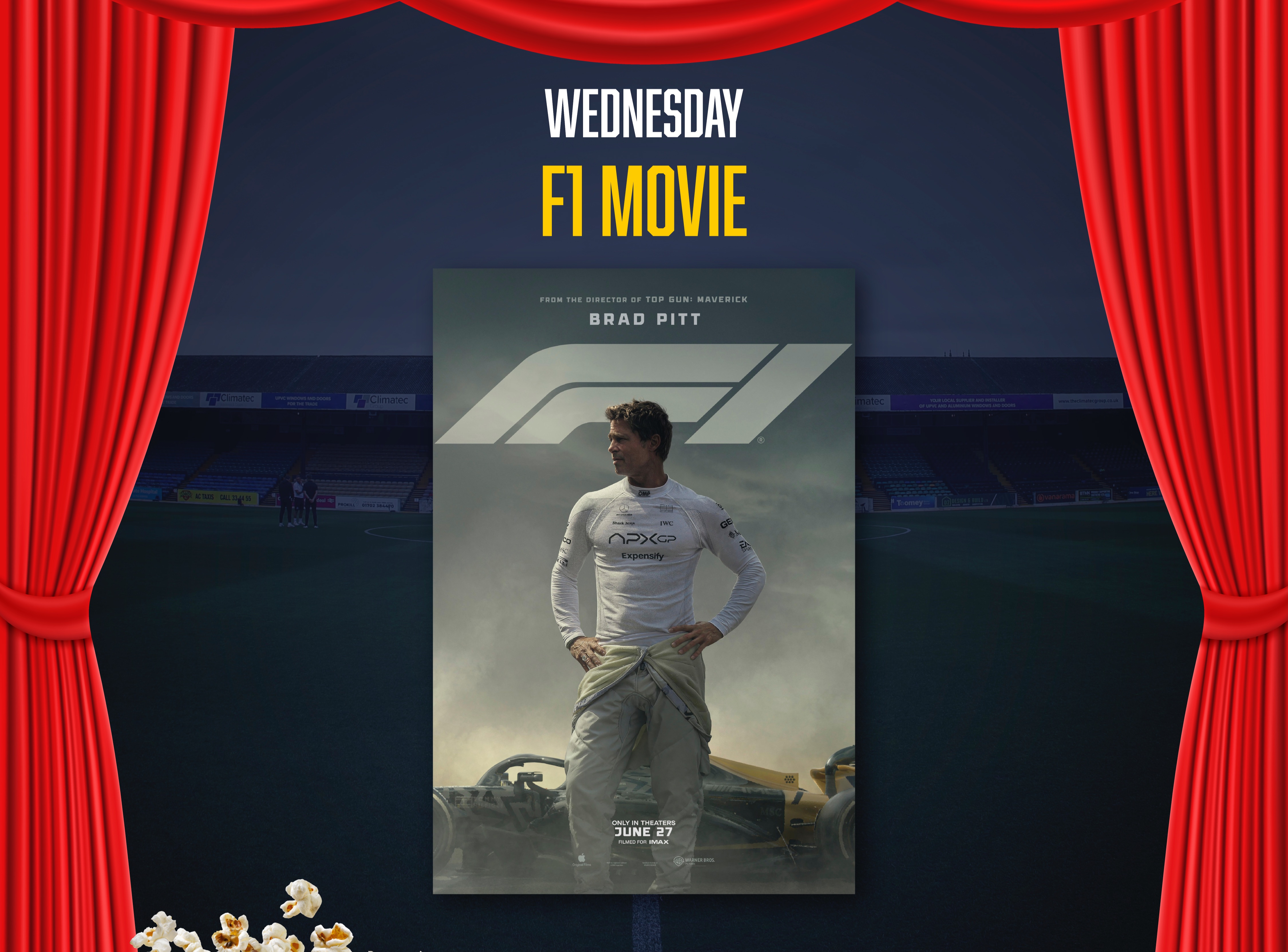 Experience the new hit movie F1: The Movie in a completely unique setting as it comes to the big screen on the pitch at Roots Hall Stadium.