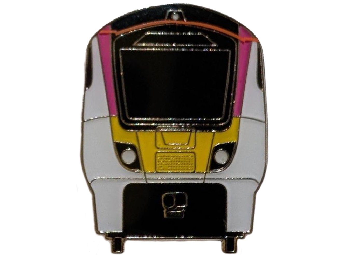 This detailed enamel badge showcases the sleek front design of the Class 720 c2c train, complete with its distinctive yellow and magenta livery.
